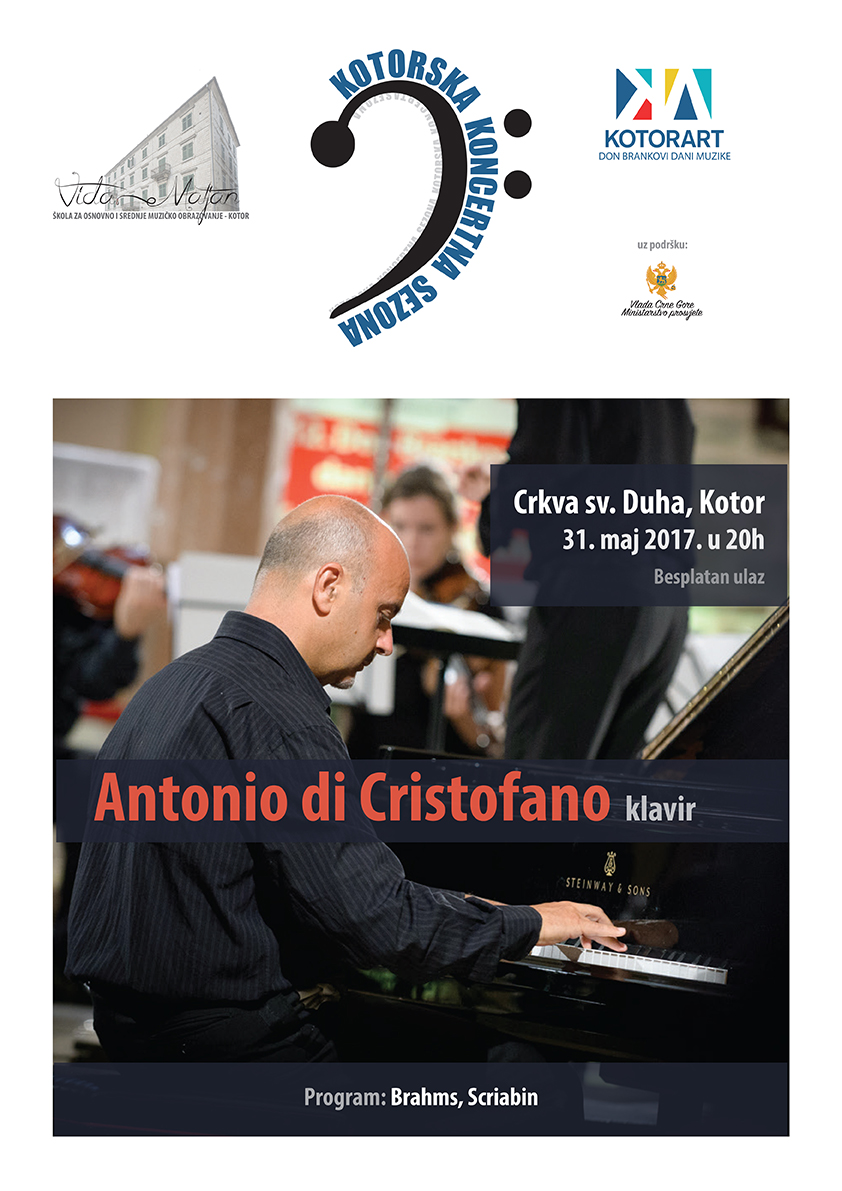 Antonio di Kristofano, pijanista (Italija) nastupa u Kotoru u okviru Kotorske Koncertne sezone. Koncert će se održati u koncertnoj dvorani muzičke škole “Vida Matjan”, crkvi sv. Duha sa početkom u 20h.