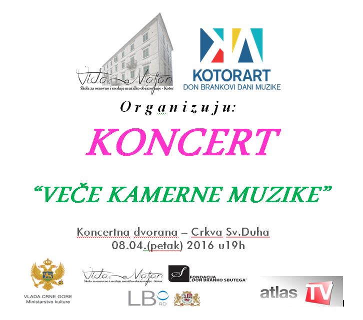 U okviru Kotorske koncertne sezone, a povodom predstojećeg XLIII Festivala mladih muzičara Crne Gore koje se održava krajem aprila u Podgorici, u petak 08.aprila u Koncertnoj dvorani - Crkva Sv.Duha u 19h održaće se koncert "VEČE KAMERNE MUZIKE" na kojem će se predstaviti učenici (takmičari) niže i srednje muzičke škole "Vida Matjan" u kategoriji kamerni sastavi. Kao gosti koncerta nastupiće i učenici muzičke škole iz Tivta.